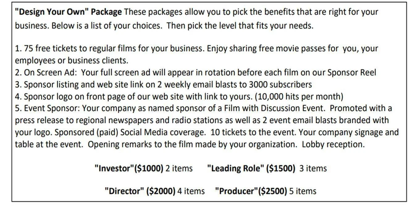 "The Oscar" ($5,000) Your company as the named sponsor of a Film with Discussion Event. Promoted with a press release to regional newspapers and radio stations, 2 Event email blasts branded with your logo, Social Media posts and company name listed on all email blasts for 1 year with link to your web site. 30 second "Commercial " Ad (you provide screen ready content). Company logo on home page of our web site with link to yours. Cocktail Party Reception at a local venue before the film screening . 20 tickets to the Film and Cocktail Reception. Your business may have a table in the lobby area with information. 4 tickets to our Annual Fundraising Event.